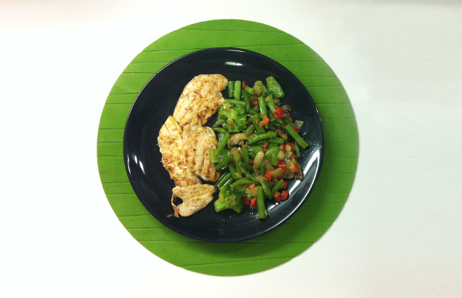Hoje deixo-vos com um almoço bastante saudável: bifes de frango grelhado com legumes salteados.