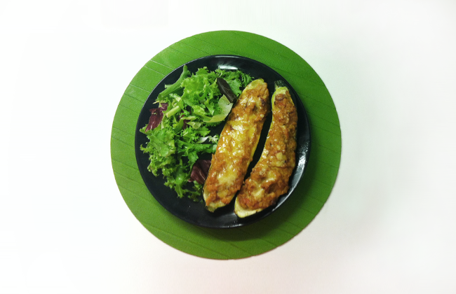 Courgettes recheadas com atum e salada de alface.