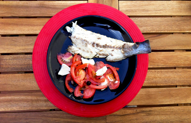Robalo grelhado, uma boa fonte de ferro e vitamina B12 e uma salada de tomate com queijo mozzarella light, fica óptimo nas saladas e é um dos queijos menos calóricos.