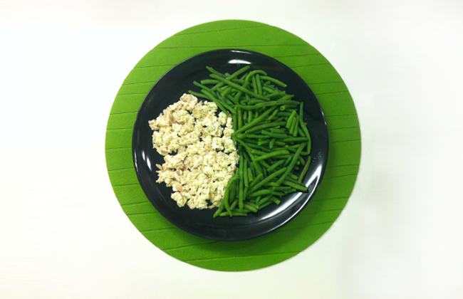 Hoje o meu almoço é clara de ovo (baixa em calorias) com atum (enlatado mas ao natural) e bastante feijão-verde (rico em fibra e vitaminas).